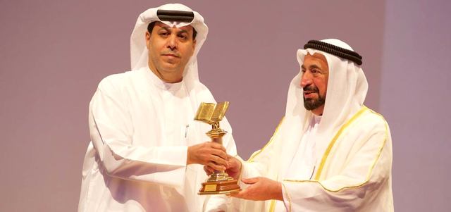 حاكم الشارقة يسلّم ظاعن شاهين جائزة صحيفة «البيان» عن فئة أفضل كتاب إماراتي / مطبوع عن الإمارات. وام