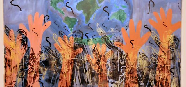 وفي قاعة أخرى بعيدة عن القاعة التي تعرض فيها لوحة الطفلة السورية، ولكنها قريبة جداً إليها في المعاناة، تبدو لوحة أشد مأساوية للطفل الباكستاني أيمن الخالق، تظهر فيها الكرة الأرضية وهي تحترق نتيجة ما أحدثه البشر فيها من أفعال أيديهم الموغلة في القسوة والإساءة.