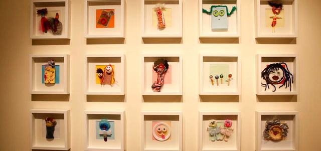 وغير بعيد عنها، في القاعة نفسها، يكتسي الجدار بـ15 لوحة صغيرة للطفلة فاطمة فرج الأميري، ابنة السبع سنوات، والتي تتضمن كل واحدة منها دمية استوحتها من أفكارها، وصنعتها من مواد موجودة في المنزل، باستخدام القماش، والورق، والقطن، والفلين، والأزرار، والأعواد الخشبية، وخيوط الصوف، وغيرها من المواد التي يمكن العثور عليها ببساطة في أي مكان، بل يمكن الاستفادة من المخلّفات الخاصة بمشاغل الخياطة ومصانع الورق في إنتاجها وتحويلها إلى لوحات فنية بديعة الشكل.