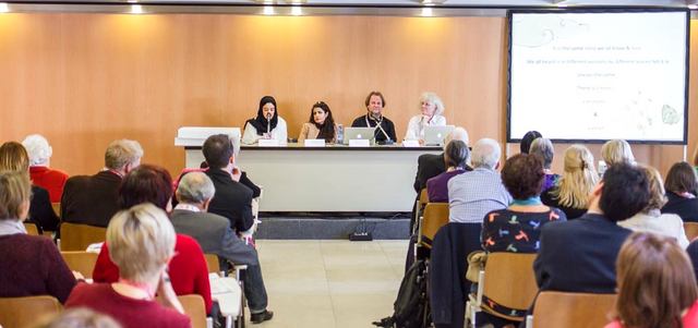 مروة العقروبي ونسيم عبائيان ووالي دي دنكر وليز باج خلال مشاركتهم في الاجتماع العام للمجلس الدولي لكتب اليافعين. من المصدر
