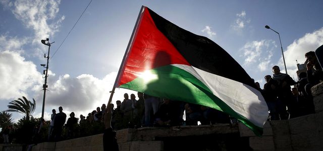 العلم الفلسطيني عالياً خلال تظاهرة خارج باب العامود في مدينة القدس القديمة بمناسبة «يوم الأرض». رويترز