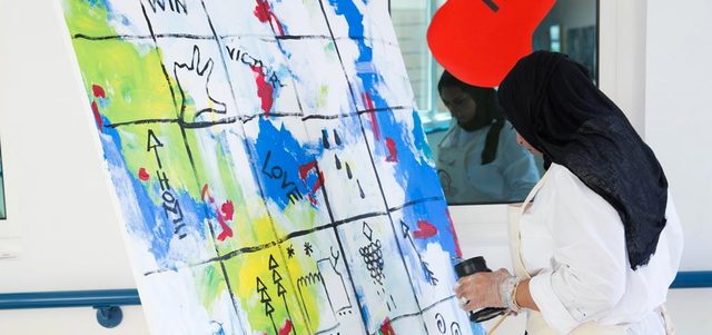الفنانة الصربية غالا كاكي، تزور دبي للمرة الأولى، تفاعلت مع المكان، واختارت التغريدة التي تبرز أهمية التعليم للأطفال. وأكدت أنها ستقوم برسم صورة لصاحب السمو الشيخ محمد بن راشد آل مكتوم في لوحاتها، قائلة إن «سموه من الشخصيات التي يجب أن تكون موجودة في كل مجتمع، فهو شخصية تتمتع بالعطاء والحكمة». ولفتت إلى أنها تذهب إلى البورتريه كونها تعبر عن الناس من خلال الملامح، إلى جانب كونها تعتبرها الطريقة الأبرز في التعبير، لاسيما من خلال الخطوط.