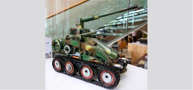 الآلات العسكرية، كان لها حصة أيضاً من خلال المعرض ومن ضمن السيارات، حيث جسدت بشكل مميز، فكانت الأقرب من بين المعروضات إلى التجسيد الواقعي للآلة، ولاسيما التي أخذت ألوان الطلاء العسكري. وإلى جانب التجسيد المباشر للآليات والسيارات، ضم المعرض مجموعة من القطع على شكل رجل آلي، أو حتى رأس الحصان، الذي كان من الواضح أنه القطعة الأكثر تعقيداً في المعرض، لجهة عدد القطع الموجودة فيه، وكذلك الأسلوب الذي صمم به.