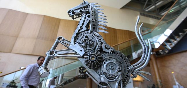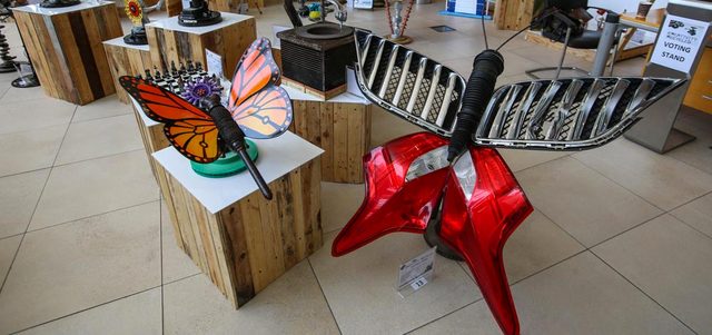 بين أشكال الفراشات والرجل الآلي والأبراج الشاهقة أو الدرّاجات النارية والسيارات والأحصنة، تأخذنا القطع الفنية المعروضة في صالة الطاير للسيارات، إلى جماليات وقطع من الفن الحقيقي، أُنتجت من خلال قطع غيار السيارات فقط. يقدم المعرض الذي يضم أكثر من 90 قطعة جمالاً فنياً من نوع مختلف، فهو يبرز كيف تحولت الأدوات المعدنية إلى تحف مميزة، بعضها يحمل صلابة الحديد وصلابة السيارات التي أخذت منها، وأخرى كانت شديدة الرقة وباتت قطعة فنية أنيقة ببساطتها والألوان التي أدخلت عليها.
