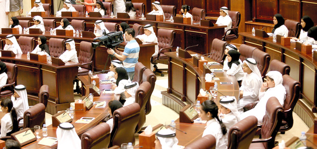 عقد «المجلس» أولى جلساته برئاسة الطفلة جميلة حسن الزعابي رئيسة المجلس، بحضور النائب الأول للرئيس الطفل راشد سيف الطنيجي، والنائب الثاني للرئيس الطفلة حصة جاسم صالح، وأمين سر المجلس الطفل علي محمد سرور. تصوير: تشاندرا بالان
