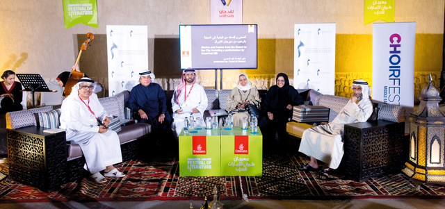 التراث كان الناظم المهيمين على أمسية «قصص وقصائد من البادية إلى المدينة» التي نظمها مهرجان طيران الإمارات للآداب في مقر مركز دبي الدولي للكتاب. تصوير: أحمد عرديتي