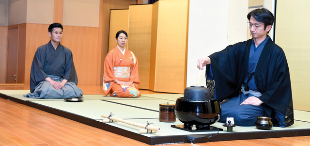 وصاحب المحاضرة عرض أدائي حي على المسرح لفن وتقاليد الشاي الياباني، وفي ختامها انتقل الحضور إلى الصالة المركزية «الأتريوم»، بوسط الحرم الجامعي، حيث تم تقديم الشاي وتذوقه وفق أصوله اليابانية.