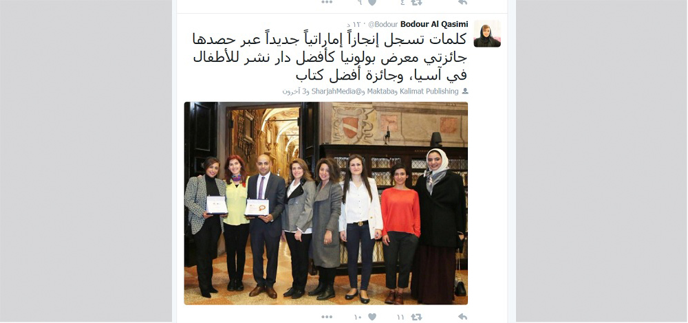 وقالت الشيخة بدور بنت سلطان بن محمد القاسمي، رئيس هيئة الشارقة للاستثمار والتطوير (شروق)، المؤسس والرئيس التنفيذي لمجموعة كلمات للنشر، عبر حسابها الرسمي بموقع التواصل الإجتماعي "تويتر"، "كلمات تسجل إنجازاً إماراتياً جديداً عبر حصدها جائزتي معرض بولونيا كأفضل دار نشر للأطفال في آسيا، وجائزة أفضل كتاب".