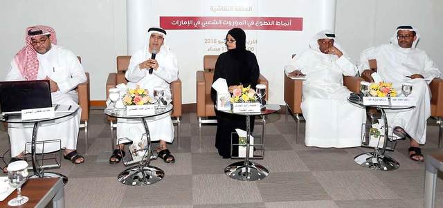 المتحدثون في الحلقة النقاشية التي جاءت ى بعنوان «أنماط التطوع في الموروث الشعبي الإماراتي». من المصدر