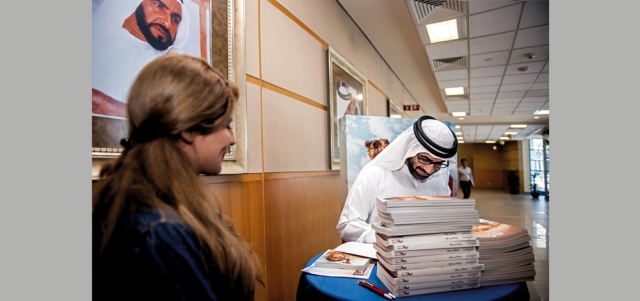 بن دلموك يوقّع «المتوصف» لطالبة في جامعة زايد. من المصدر