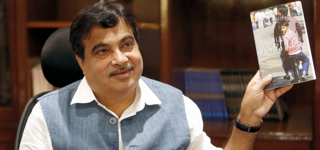 وزير النقل الهندي نيتين جادكاري، يعرض أحد إصداراته عن طموح الهند في إحدى المكتبات بنيودلهي، أمس.