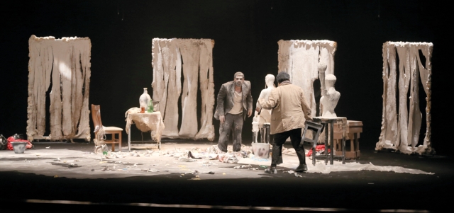 وما بين نحات يقضي ليله ونهاره مخموراً فاقداً للوعي، تارة بفعل «الخمر» وأخرى مدفوعاً بتضخم «الأنا»، وبين تابع بدا في عمل حسن يوسف كأنه ضمير أكثر من كونه تابعاً أو مساعداً، بدليل العديد من الإشارات منها رده على سيده برفضه الخروج من المكان وكان تعليله: «لن أخرج.. فوجودي مرتبط بوجودك».