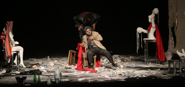 وعبر ديكور مرتب بعناية، قوامه بعض الطاولات الخشبية الصغيرة، وعدد من التماثيل، جاء فضاء المسرح رحباً، لحركة «الملك لير» الذي يؤدي دوره الفنان إبراهيم استادي، ومساعده «بهلول»، في حين حكمت رؤية يوسف الفنية باستبعاد شخصيات أخرى حضرت في ما كتبه شكسبير، وجاءت التماثيل لتستعيض عن بعضها، خصوصاً بنات الملك الثلاث، محور الأزمة.