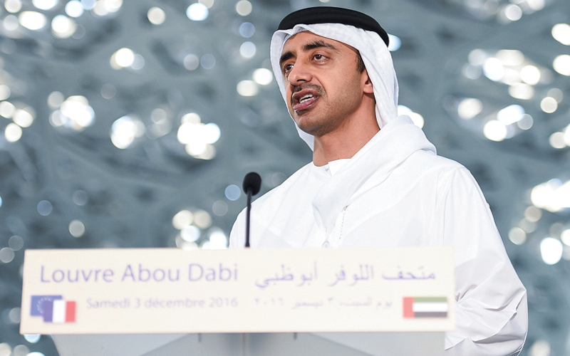 وأشاد الشيخ عبدالله بن زايد بطبيعة العلاقات التي تربط بين الإمارات وفرنسا، وما تتميز به من أفق فكري ثقافي ومعرفي «وهي غاية أية علاقة». وأضاف: «في السنة المقبلة سيكون هذا المعرض مكتملاً ومليئاً بالتحف والمقتنيات وأيضاً بالناس والأفكار».