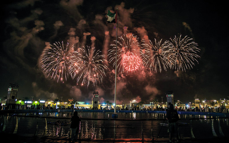 واستمتع زوار المهرجان بمشاهدة أكثر من 2000 عرض فلكلوري قدمتها عشرات الفرق الشعبية الإماراتية والخليجية والعربية والعالمية التي ضمت أكثر من 800 عازف وعارض أدوا عروضهم في كل أجنحة وساحات المهرجان التي ضمت أكثر من 500 محل ومطعم، بالإضافة إلى أكثر من 250 عرضاً لنافورة الإمارات، وأكثر من 50 عرضاً للألعاب النارية التي زينت سماء المهرجان ومنطقة الوثبة.
