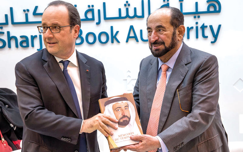 بحضور صاحب السمو الشيخ الدكتور سلطان بن محمد القاسمي، عضو المجلس الأعلى حاكم الشارقة، أعلن رئيس جمهورية فرنسا، فرانسوا هولاند، عن اختيار الشارقة لتكون ضيف شرف الدورة المقبلة من معرض باريس للكتاب 2018.