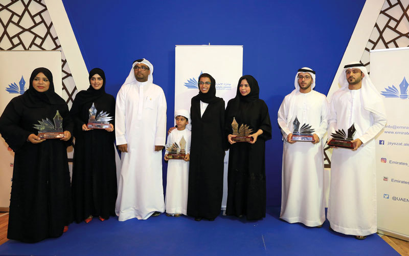 وسلمت الكعبي، خلال الحفل، الجوائز إلى الفائزين بفئات جائزة الإمارات للرواية، التي أعلنت أخيراً، وهم: مريم الغفلي الفائزة بالمركز الأول في فئة الرواية الطويلة عن روايتها «أيام الزغنبوت»، وتسلم الجائزة عنها نجلها. ونجاة المرزوقي الفائزة بالمركز الثاني في الفئة ذاتها عن روايتها «نسيت من أكون»، ومحمد الحمادي الذي حصل على المركز الثالث عن روايته «البحث عن مملكة الشمس»، وتسلم جائزته ابنه الصغير.