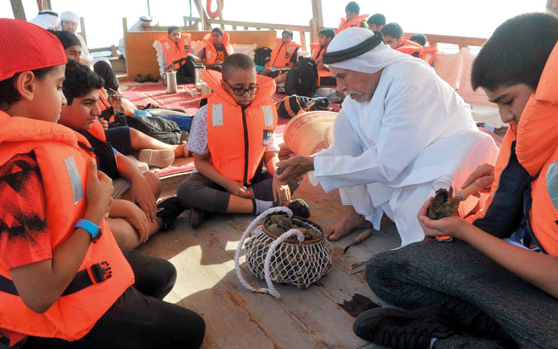وشهد كورنيش أبوظبي، المقابل للقرية التراثية التابعة للنادي، أولى طلعات السفينة التراثية التي حملت عدداً من طلبة الملتقى في جولة بحرية، لتعريفهم بما تمثله البيئة البحرية من جانب خصب في الحياة الإماراتية. وبيّن مدير القرية التراثية، أحمد عبدالله المهيري، أن طلعات السفينة ستستمر في كورنيش أبوظبي مدة أسبوعين، تنتقل بعدها إلى شواطئ جزيرة السمالية لمواصلة برنامجها مع طلبة الملتقى هناك، موضحاً أنه يتم على متن السفينة تقديم الشروح والعروض الحية التي يعرضها الخبير والمدرب التراثي حثبور كداس الرميثي، حول رحلات الغوص التقليدية، وما يلزمها من أدوات، إلى جانب تنفيذ عملية فلق المحار واستخراج اللؤلؤ منه، وفرز اللؤلؤ إلى أحجامه المتباينة، وطرق صناعة شباك الصيد وأدوات الغوص، إضافة إلى ما تعرضه السفينة من أدوات متنوعة يستخدمها أهل البحر في طرق صيدهم التقليدية، والبحارة في رحلات مراكبهم، وأخرى يستخدمها صيادو اللؤلؤ وتجاره، مضيفاً أن القرية التراثية تواصل، إلى جانب ذلك، مجلسها التراثي الذي انطلق في مجلس القرية، عصر الأربعاء، حيث يلتقي المدرب التراثي الشاعر محمد بن يعروف المنصوري يومياً مع طلبة الملتقى، لتبصيرهم بالكثير من مفردات تراث الأجداد، خصوصاً العادات والتقاليد العربية الأصيلة، وكل ما يتعلق بمفاهيم السنع الإماراتي.