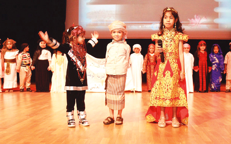 أطفال المدارس بالأزياء التقليدية للشعوب العربية. من المصدر