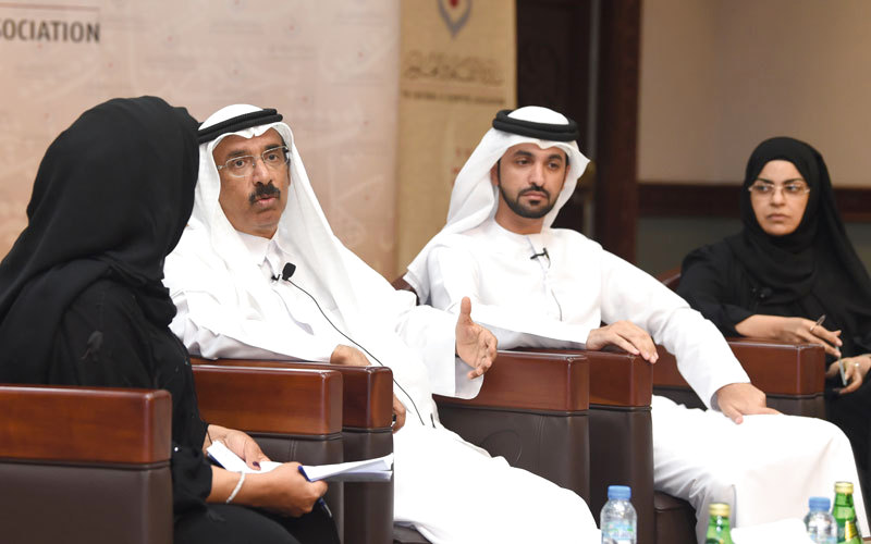 المر متحدثاً خلال الجلسة بحضور عائشة سلطان والسعد المنهالي والمرزوقي. تصوير: أسامة أبوغانم