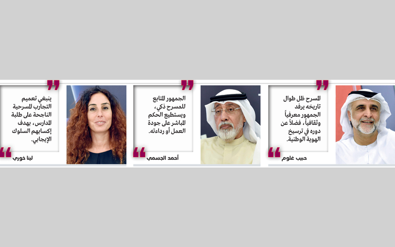 من جانبه، قال المستشار في وزراة الثقافة وتنمية المعرفة، الدكتور حبيب غلوم: «إن المسرح هو الذي شكل البدايات الأولى للفنون، ولعب دوراً كبيراً في حياة الشعوب، وظل طوال تاريخه يرفد الجمهور معرفياً وثقافياً، فضلاً عن دوره في ترسيخ الهوية الوطنية، وتوفير حلول لمشكلات المجتمع، فالمسرح مرآة واضحة لملامح الواقع».