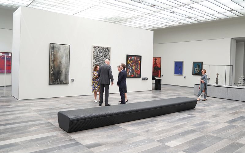 - الهدف الرئيس للمتحف هو إتاحة الفرصة أمام الزوار ليكتشفوا بأنفسهم مسيرة تطور الفن في مختلف الثقافات والحضارات حول العالم. - تتميز طريقة العرض داخل المتحف بأسلوب مركزي؛ إذ تغطي الأعمال الفنية المترابطة مساراً واحداً فريداً من نوعه، وهو الطريق الرئيس الذي سيمر به الزوار. جولة تضمنت جولة المتحف أقدم التحف والقطع الفنية، منها قناع جنائزي برونزي ذهبي من شمال الصين 907-1152 قبل الميلاد، وتمثالاً حجرياً برأسين يبلغ عمره 8000 عام من دائرة الآثار العامة الأردنية ويسمى تمثال «عين غزال»، و«نصل فأس» من متحف العين الوطني يعود تاريخه إلى 1600 قبل الميلاد، وتمثال لرمسيس الثاني فرعون مصر 1279-1213 قبل الميلاد، وتنين مجنح من شمال الصين 450-250 قبل الميلاد. أما الأديان العالمية وطرق التجارة العالمية الناشئة، فتمثلت في قطع وتحف فنية، مثل كتاب مقدس قوطي في مجلدين (1250-1280)، وأسد «ماري-تشا» من جنوب إسبانيا أو جنوب إيطاليا (1000-1200). أعمال معارة تشمل مجموعة الأعمال المعارة من المتاحف الفرنسية لوحة «الحدادة الجميلة» للفنان العالمي ليوناردو دافينشي من متحف اللوفر، و«صراع بين كروغاس وداموكسين» (1797-1803) للفنان أنطونيو كانوفا، و«نابليون بونابرت القنصل الأول عابراً جبال الألب» للفنان جاك لوي دافيد من المتحف الوطني لقصر فيرساي وتريانون. وتوضح هذه الأعمال وجهات النظر المتغيرة عن العالم والفن الحديث الذي ظهر في القرن الثامن عشر. وتضمنت القطع الفنية المعروضة في المجموعات الحديثة والعصرية «أمير شاب أثناء الدراسة» للرسام التركي عثمان حمدي باي (1878)، و«صورة ذاتية» لفينسنت فان غوخ المستعارة من متحف أورسيه، و«فتية يتصارعون» للرسام بول غوغان، و«المشي رقم 2»، وهي مجموعة من الصور الفوتوغرافية لعرض من (1983) للفنان الإماراتي حسن شريف. |