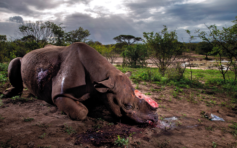 وجسدت صور «برينت ستيرتن» المصور الشهير في توثيق الحياة البرية، مشاهد مؤثرة في محاولة أطباء بيطريين رتق الجروح العميقة، التي تسبب بها صائدو القرون الذين وصلت وحشيتهم لقطع وجه وحيد القرن باستخدام الفأس، لينتقل بعد ذلك المصور إلى مشهد أكثر تاثيراً يظهر فيه وحيد القرن الأسود ميتاً في محمية هلوهلوي أمغولوزي جيم، في جنوب إفريقيا.