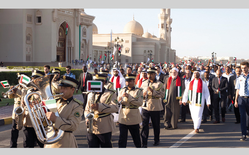 وشارك مدير الجامعة، الدكتور رشاد سالم، وأعضاء الهيئتين الإدارية والتدريسية وطلبة الجامعة في المسيرة من أمام الجامعة، وتقدمتهم الفرقة العسكرية لأكاديمية الشارقة للعلوم الشرطية.