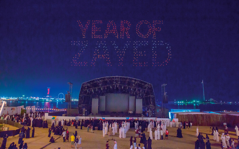 وتوجهت أنظار الجمهور إلى السماء، في الدقائق الأخيرة من فعاليات النسخة الثالثة من مهرجان «أم الإمارات»، لمتابعة العرض الضخم للألعاب النارية الذي امتد على مساحة 600 متر على سطح الماء، حيث انطلقت الألعاب النارية من سبع منصات بحرية، ووصل ارتفاعها إلى مسافة 900 متر لتضيء السماء بألوان علم دولة الإمارات، بالإضافة إلى عرض «عام زايد» الأول من نوعه على مستوى المنطقة، حيث قدم سرب يتكون من 500 طائرة بدون طيار (درون) في سماء كورنيش أبوظبي، فطافت الطائرات فوق الماء، وحولت الضوء إلى خيوط ملونة مبهرة، ورسمت لوحات فنية براقة لأكثر من خمس دقائق، وشكلت لوحة ضخمة لشعار عام زايد، تحية لذكرى الوالد المؤسس الشيخ زايد بن سلطان آل نهيان، طيب الله ثراه، بالإضافة إلى لوحات أخرى، جسدت القيم التي ورثها لأبناء شعبه.