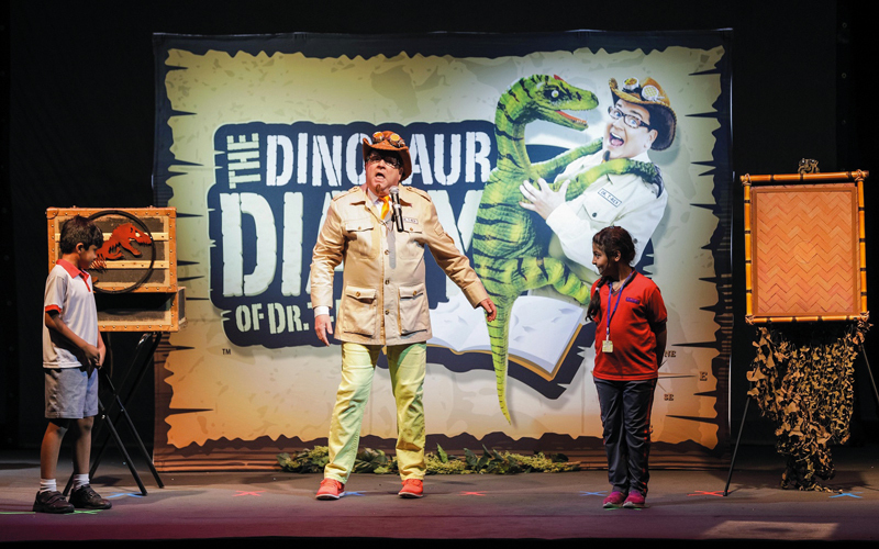 وقدّم المسرحي المتخصص في أدب الطفل، الدكتور تيريكس، خلال العرض الذي انطلق بحضور أكثر من 500 طفل، مسرحية حافلة بالمفاجآت والمعلومات التي تناولت الكثير من عثرات ما قبل التاريخ، بهدف تقديم جملة من الحقائق المفيدة للصغار والكبار عن طريق المتعة والترفيه.