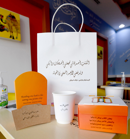 ويكمل المثقف الإماراتي شرح مشروعه بالقول «حرصت على أن تكون الديكورات الخاصة بالمطعم ذات طابع مختلف، تسافر بمن يراها إلى عصور الأدب المختلفة، فالجدران مزينة بعبارات لفلاسفة وأدباء ورؤساء دول ومؤرخين قدموا للبشرية خلاصة تجاربهم وفكرهم الأدبي، إذ اخترتُ هذه العبارات بعناية فائقة وحرصت على أن تكون متنوّعة بين حكمة ومقولة واقتباس لتناسب المستويات الثقافية للزبائن»، مضيفاً: «رغبة مني في تشجيع الزبائن على القراءة، وتماشياً أيضاً مع توجهات الحكومة في التحفيز عليها عبر تخصيص عام للقراءة وإصدار القانون الوطني للقراءة، حرصتُ على أن تعزز التفاصيل الخاصة بالمطعم هذا المفهوم».