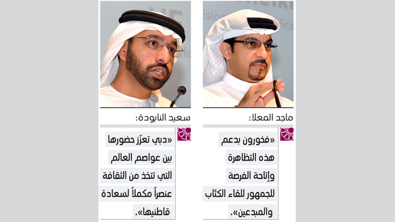 وأشار المدير العام بالإنابة لهيئة دبي للثقافة والفنون سعيد محمد النابودة، إلى «أن المهرجان يمثل امتداداً لقيم ومآثر أرساها المغفور له الشيخ زايد بن سلطان آل نهيان، طيّب الله ثراه، كوالد مؤسّس ألهم الخلف الصالح من بعده تشجيع الأجيال على حب المعرفة والثقافة والإقبال على العلم، حيث كان المغفور له يرى في ذلك (البوابة الذهبية) لانطلاق أبناء وبنات الوطن إلى مسيرة واعدة من التطور والازدهار والتقدم»، وأضاف «نفخر بما وصلت إليه قطاعات الثقافة والفنون والتراث والآداب في دولة الإمارات، كما نعرب عن اعتزازنا بمواصلة شراكتنا مع هذا المهرجان الذي بات يحتل مكانة مرموقة على الأجندات الثقافية العالمية. ويسهم في توطيد مكانة دبي لإكسابها بعداً جديداً كوجهة معرفية لتشجيع التبادل الثقافي بين الأمم والشعوب، والإسهام في نشر قيم التسامح والسلام بين مختلف الأعراق والحضارات»، وختم حديثه بالقول «بهذه الطريقة، تعزّز دبي حضورها بين العواصم العالمية التي تتخذ من الثقافة عنصراً مكملاً لسعادة قاطنيها، ومسهماً رئيساً في الاقتصاد القائم على المعرفة».