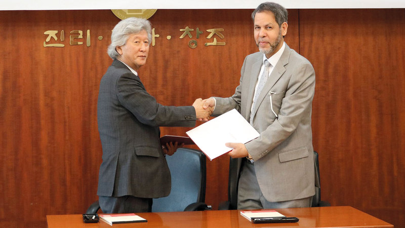 ووقّع الاتفاقية ممثلاً لجامعة هانكوك، الدكتور أو ميونغ كون، عميد كلية اللغات والثقافات الآسيوية بالجامعة، ومن جانب «المجمع» الأمين العام للمجمع الدكتور امحمد صافي المستغانمي.