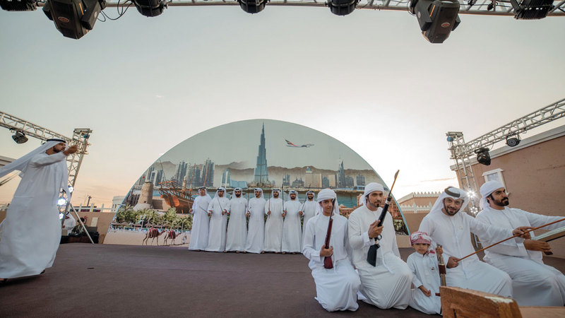 كما يستعرض الجناح أبرز الفنون الشعبية الإماراتية، حيث العروض الشعبية الضاربة في عمق الأصالة العربية، كالحربية، والعيالة، واليولة، ويقدم عديداً من الفقرات الغنائية والمشاركات المميزة للأطفال، بالإضافة إلى العروض الخاصة بأشهر الألعاب الشعبية.