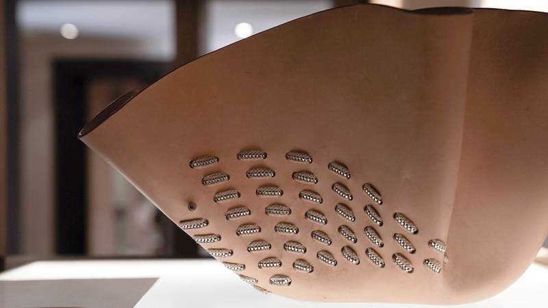 ويقدم المعرض ثلاث أوانٍ لتقديم الفاكهة، أنجزها المصمّمان الإماراتية شيخة بن ظاهر والإسباني أدريان سلفادور كانديلا، عبر دمج الجلد الإسباني الطبيعي وجدائل التلّي المنسوجة يدوياً بأحجام وأشكال متنوّعة، تقترب في تكوينها من منظر الكثبان الصحراوية وطيات حجاب النساء، وتختلف تموّجات كلّ واحدٍ منها، ما يمنحه استخداماً مختلفاً.