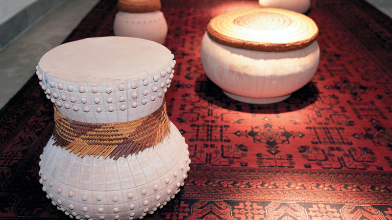 ويقدّم أيضاً المصممون ندى تريم وفيصل طبّارة وخولة الهاشمي من «العمارة وأشياء أخرى»، مقعداً مبتكراً يشبه الصخر في مجموعة «السباكة الرملية والسفيفة»، بالتعاون مع حرفيات متمرسات في نسج السفيفة من برنامج بدوة للتنمية الاجتماعية التابع لمجلس إرثي، اللواتي نسجن غطاءً للمقعد من جلد الإبل.