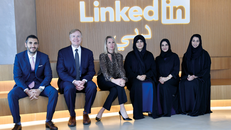 لطيفة بنت محمد خلال لقائها أعضاء شركة «لينكد إن». وام