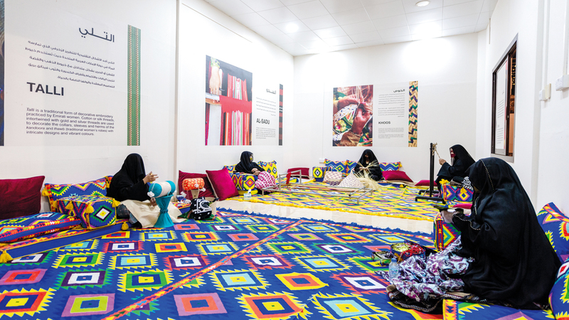 وينظم الجناح الكثير من الورش اليومية لتعليم الحرف التراثية للزوار الصغار، تتولى التدريب والإشراف عليها 15 إماراتية متخصصة في الحرف التقليدية، يعلمن الزوار كيفية ممارسة السدو والتلي وسف الخوص وغزل الصوف وصناعة البراقع النسائية، وغيرها.