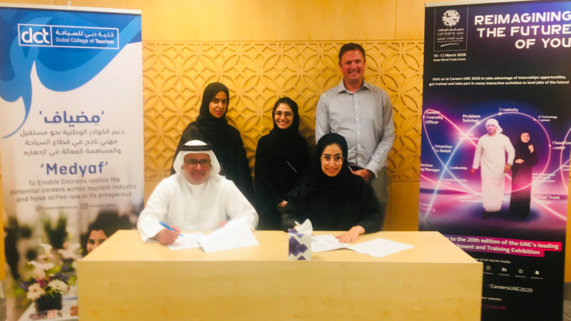 وقّع فريق «مضياف» لتوطين القطاع السياحي في كلية دبي للسياحة، مؤسسة التعليم المهني التابعة لدائرة السياحة والتسويق التجاري بدبي (دبي للسياحة)، أخيراً، مذكّرة تفاهم مع إدارة المعارض والمؤتمرات في مركز دبي التجاري العالمي، وذلك لاستضافة فعاليات اليوم المفتوح، التي تنظمها الكلية على مدار العام لمساعدة الباحثين عن فرص عمل في السياحة وتجارة التجزئة والضيافة، بما يسهم في دفع عجلة التوطين في هذه القطاعات.