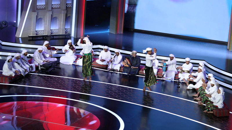 فرقة حضرموت للفنون الشعبية تقدم لوحاتها على المسرح. من المصدر