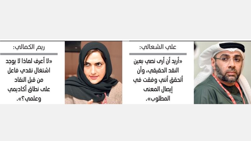 من ناحيتها، أكدت ريم الكمالي، غياب حركة نقدية فعلية، وعدم الاشتغال على الأدب الإماراتي إلا من بعض النقاد العرب الموجودين في الدولة، مقابل غياب الناقد الإماراتي، الأمر الذي عرضها في كثير من الأحيان إلى النقد غير الموضوعي الذي وصل إلى حدود التجريح في بعض الأحيان، متسائلة: «لا أعرف لماذا لا يوجد اشتغال نقدي فاعل من قبل النقاد على نطاق أكاديمي وعلمي؟»؛ الأمر الذي علق عليه الكاتب الكويتي حسين المطوّع، بالتأكيد على الحاجة الضرورية لوجود مؤسسات نقد عربية حقيقية، ومؤسسات دراسات متخصصة في العلوم الاجتماعية والنفسية، أسوة بمدارس النقد في العالم الغربي، التي لا تنفصل عن الواقع والمجتمع الذي تتناوله الأعمال الأدبية التي تخضع لشروط مضبوطة وصارمة.