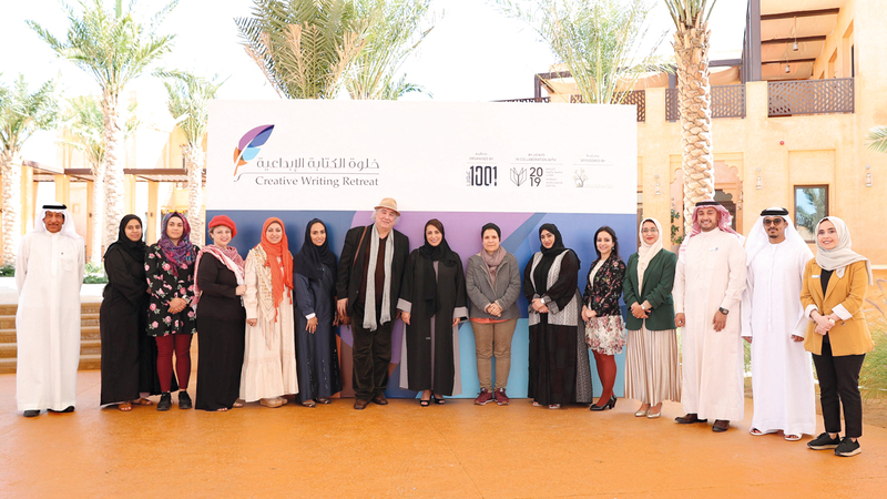 بدور القاسمي تتوسط المدربين والمشاركين في خلوة الكتابة الإبداعية. من المصدر