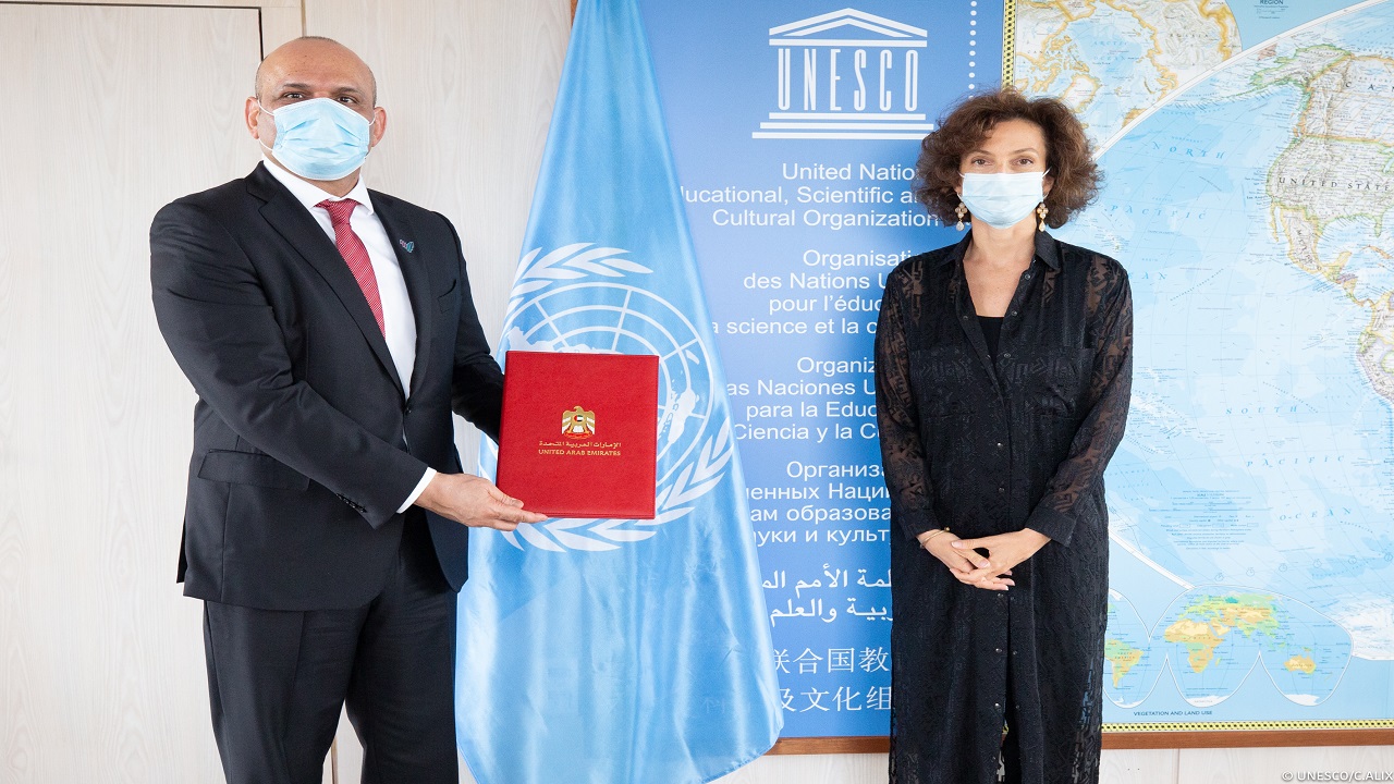 وأضاف: «تتشارك دولة الإمارات ومنظمة اليونيسكو القيم والمبادئ القائمة على ثقافة التسامح والتعايش، وصون التراث الثقافي الإنساني في جميع أنحاء العالم.. سنعمل مع الدول الأعضاء على توسيع آفاق التعاون الدولي، وتفعيل الحوار العالمي مع شركائنا وأصدقائنا في المنظمة».