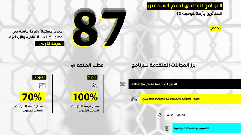 قدّم البرنامج الوطني لدعم المبدعين، الذي أطلقته وزارة الثقافة وتنمية المعرفة 87 منحة مالية، للمبدعين المستقلين والشركات العاملة في قطاع الصناعات الثقافية والإبداعية، توزّعت على 50 منحة للأفراد، و37 منحة للشركات راوحت بين 15-50 ألف درهم، وذلك لمساعدتها على الصمود وتجاوز الصعوبات الناجمة عن «كوفيد-19»، حيث تُعد الإمارات أول دولة في المنطقة تطلق برنامجاً خاصاً لدعم المبدعين المتأثرين بـ«كوفيد-19» بما يعزّز مكانة الإمارات حاضنة للفكر والثقافة والإبداع، ويعكس حرص القيادة على تقديم مختلف أشكال الدعم لهذا القطاع الحيوي.