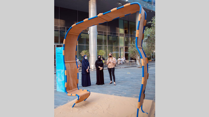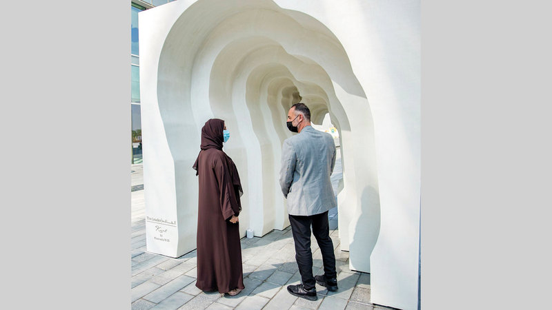 واطلعت هالة بدري أيضاً على مجموعة من التركيبات الخارجية، شملت معرض «أبواب» الذي حاز المصمم العراقي هوزان زنكنة منحته لإنتاج مشروعه المقترح بعنوان «فتى مرجانة»، وهو عبارة عن إطار مفاهيمي لمخطط مفتوح يضم مجموعة أعمدة أساسية ترمز كل واحدة منها إلى إمارة من الإمارات السبع.