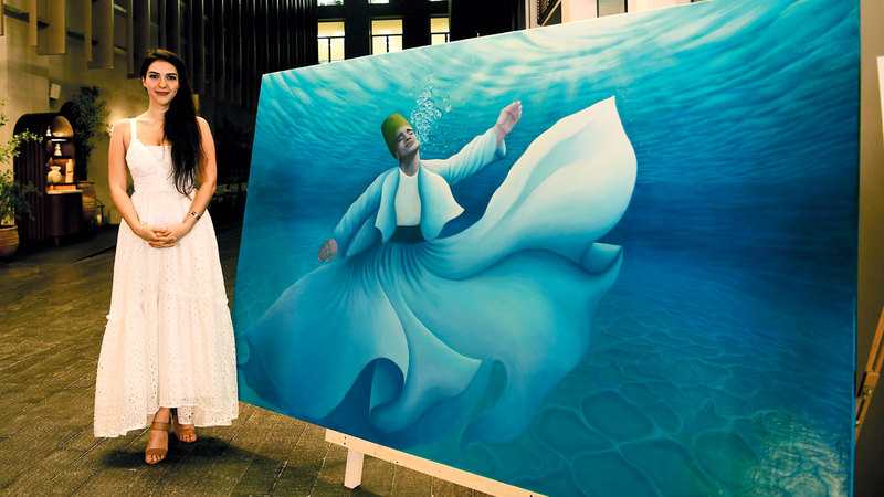 الفنانة الألمانية والتركية الأصل غولدين أوغوس، رسمت الدرويش تحت الماء وفي الصحراء، متأثرة بشعر جلال الدين الرومي، ولفتت أوغوس إلى أنها بدأت برسم الدرويش بعد أن قرأت أشعار الرومي، فقد حملت كثيراً من المفاهيم من خلال الشعر الخاص به، ما جعلها تعبّر عن هذه المفاهيم والمشاعر من خلال الرسم. واعتبرت أوغوس أن التأمل الذي يقوم به الدرويش، من خلال الرقص وملابسه يحمل كثيراً من المشاعر التي تبرزها عبر طبقات كثيرة من الألوان، فاللوحة التي تظهر بالأزرق تحمل كثيراً من الألوان لكنها مكونة من طبقات رقيقة جداً، ما يجعل اللوحة تستغرق ما يقارب ستة أشهر حتى تنجزها بشكل تام. وأكدت أنها تعبّر من خلال الطبيعة أيضاً عن مشاعرها لأنها تحب الطبيعة، وهذا ما دفعها إلى رسم البحر فيما كانت لوحة الصحراء إهداء منها إلى الإمارات.