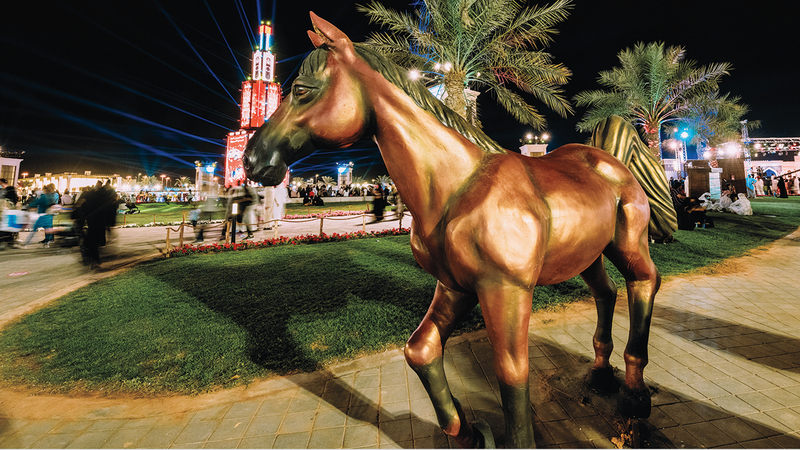 كما تنتشر في طرقات المهرجان وساحاته العديد من المجسمات الفنية الإبداعية الكبيرة اللافتة للنظر، والجاذبة للجمهور لالتقاط صور تذكارية معها، مثل مجسم الصقر، ومجسم الحصان، والمباخر، ومجسمات المدافع القديمة التي كانت تستخدم في حماية القصور، كما صممت البوابات الرئيسة للمهرجان والسور المحيط بمنطقة المهرجان بشكل يحاكي سور وأبراج قصر الحصن التاريخي في أبوظبي والقلاع الإماراتية القديمة.