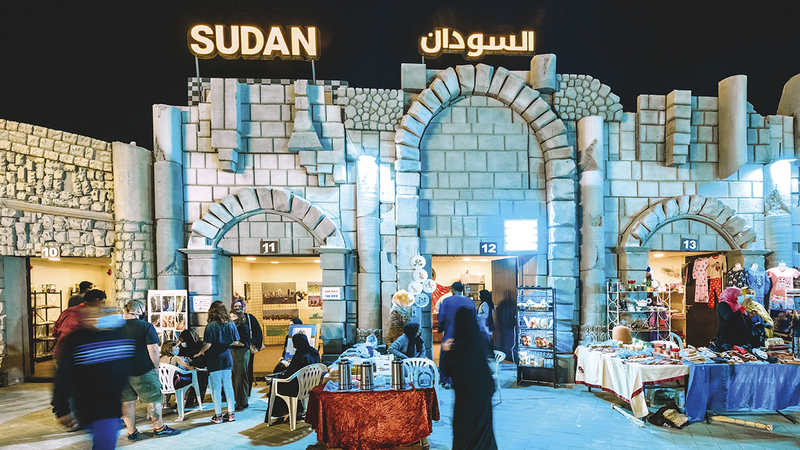 وتعد واجهات أجنحة ومحال المهرجان تحفاً فنية تحبس الأنفاس وتحاكي أبرز المناطق الأثرية والتاريخية في الدول المشاركة، حيث تم اختيارها بعناية لتكون حاضرة في أجنحة المهرجان، بواقع معلمين أو ثلاثة معالم شهيرة من كل دولة مشاركة، وقد روعي أن تكون المكونات كافة قريبة من بعضها في القيمة والتاريخ والأهمية، وأن تتوافق مع الشكل العام للمهرجان وتعكس حضارة وثقافة الشعوب، وتتماشى كذلك مع طبيعة بناء المحال وأبوابها وكأن المحال جزء من هذه المعالم.