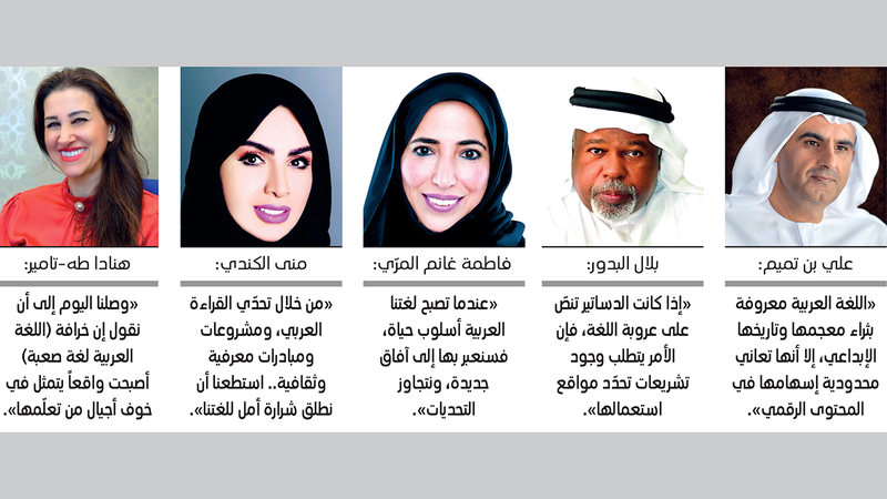 فيما أوضحت رئيسة منظمة «تربويّون بلا حدود»، الدكتورة كريمة مطر المزروعي، أن : «اللغة العربية لا تحتاج إلى مبادرات وقتية أو احتفاليات سنوية ترتبط بيوم واحد، بل تحتاج إلى وضع نظام وسياسات متكاملة تنظر للنظام التعليمي في تدريس اللغة العربية بشكل متكامل. فالنظام التعليمي ليس معلّماً وكتاباً فقط، بل منظومة متكاملة تعضد بعضها بعضاً».من جهتها، قالت الأمين العام لتحدي القراءة العربي، منى الكندي: «قد لا نستطيع في سنوات قليلة إحداث انقلاب كامل في العقلية العربية، أو نجتث عقوداً من الرخاوة والكسل المعرفي، فالتغيير يحتاج حفراً وئيداً في العقل العربي. ويمكننا القول إننا من خلال تحدّي القراءة العربي ومشروعات ومبادرات معرفية وثقافية عدة، استطعنا أن نطلق شرارة أمل، وأمامنا جميعاً مسؤولية المحافظة عليها كي تظل جذوتها متقدة، بالمتابعة والدعم والاستمرار والاحتفاء بملايين القرّاء العرب من الشباب». بينما قالت أستاذ كرسي اللغة العربية في جامعة زايد، الدكتورة هنادا طه-تامير: «قد نكون وصلنا اليوم إلى أن نقول إن خرافة (اللغة العربية لغة صعبة) أصبحت واقعاً يتمثل في خوف أجيال بكاملها من اللغة العربية، وفي عدم استخدامهم أو إتقانهم لها، وفي الشعور بأنها ليست في متناول أيديهم، وعقولهم، وقلوبهم».