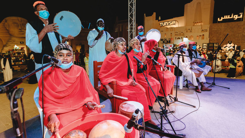 على خشبة مسرح الجناح السوداني في مهرجان الشيخ زايد، تطل بشكل يومي الفرقة السودانية للفنون الشعبية باستعراضاتها المميزة، التي تشكل مزيجاً من الفلكلور الإفريقي والعربي، يؤديه أعضاء الفرقة عبر وصلات غنائية، ورقصات تجسد الموروث الفني السوداني بمختلف تنوعاته، لتضفي أجواءً من المتعة، وتدخل البهجة إلى قلوب زوار الجناح من مختلف الجنسيات.